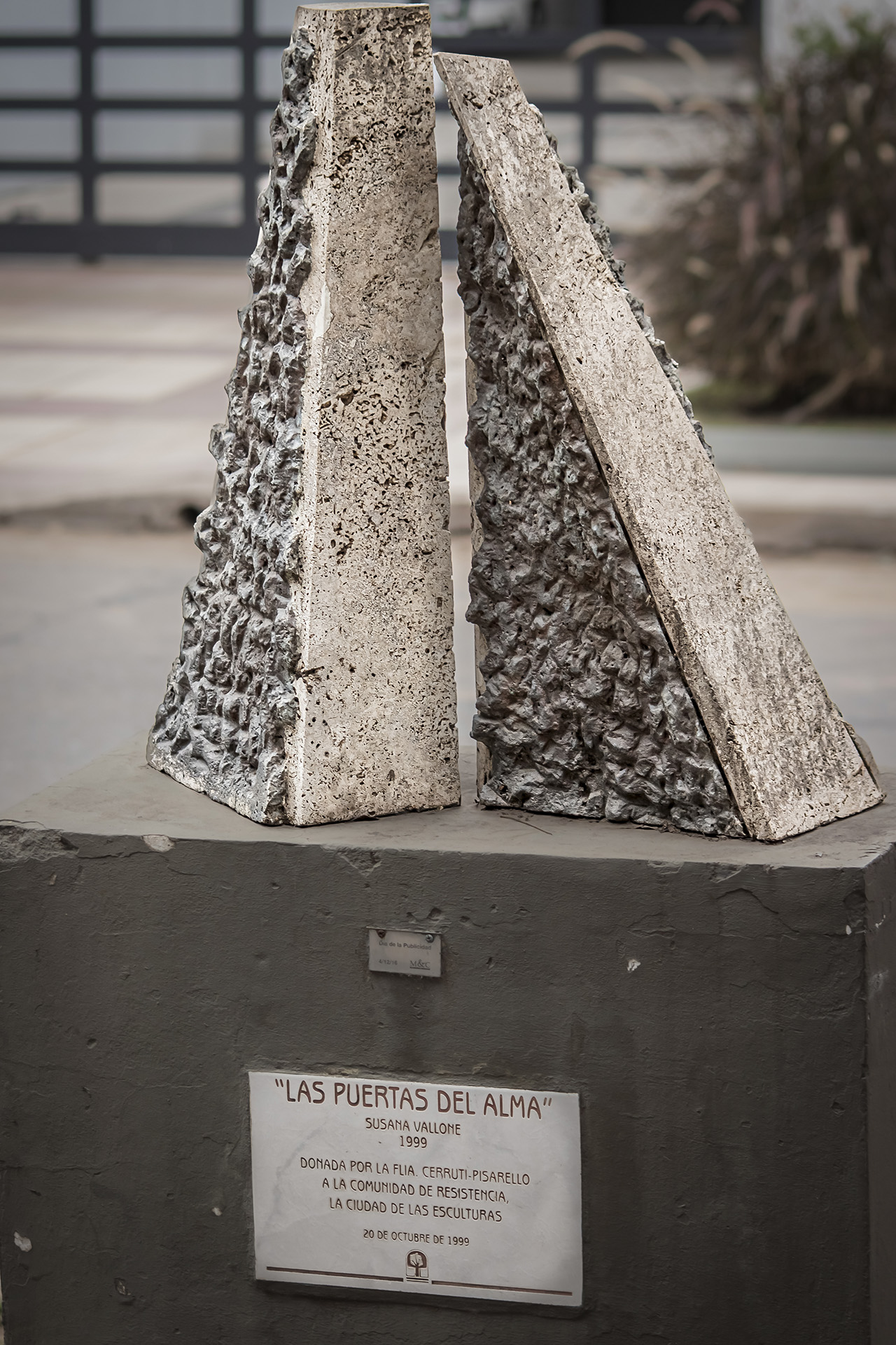 Esta escultura, titulada "Las puertas del alma", forma parte de la colección del Museo a Cielo Abierto de Resistencia. Fue creada por Susana Vallone de Argentina. La obra está realizada en Mármol travertino. Sus dimensiones son 70 cm (alto) x 72 cm (ancho) x 33 cm (profundidad), con una base de 97 cm (alto) x 81 cm (ancho) x 39 cm (profundidad). Actualmente se encuentra ubicada en Almte. Brown 282 desde el año 1999.